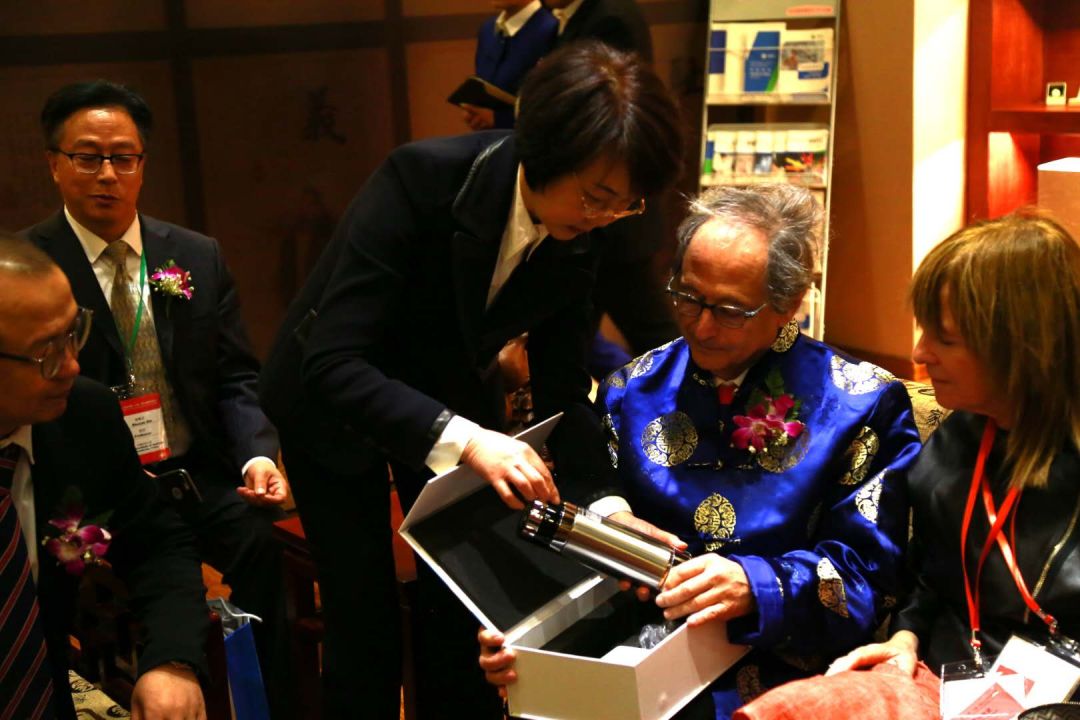 陈玉琦董事长郑重地为三位诺奖大师颁发珍奥、双迪科研荣誉顾问科研荣誉顾问聘书,潘晓非董事长向诺奖科学家赠送饱含中国文化元素的双迪司徽和字币礼盒和珠联璧合玉器。相信有世界顶级科学家的宝贵智力支持,双迪产品、技术、服务的科技之光将更加耀眼!