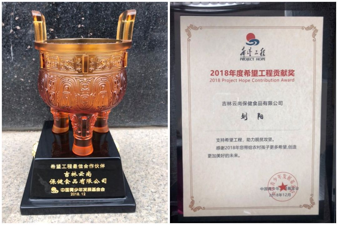 为表达对云尚公司热心公益事业的认可,中国青基会授予吉林云尚公司“希望工程最佳合作伙伴”,授予吉林云尚公司总裁刘阳先生“2018年度希望工程贡献奖”。以此表彰云尚公司及云尚总裁刘阳先生在希望工程事业中所做出的支持与贡献。