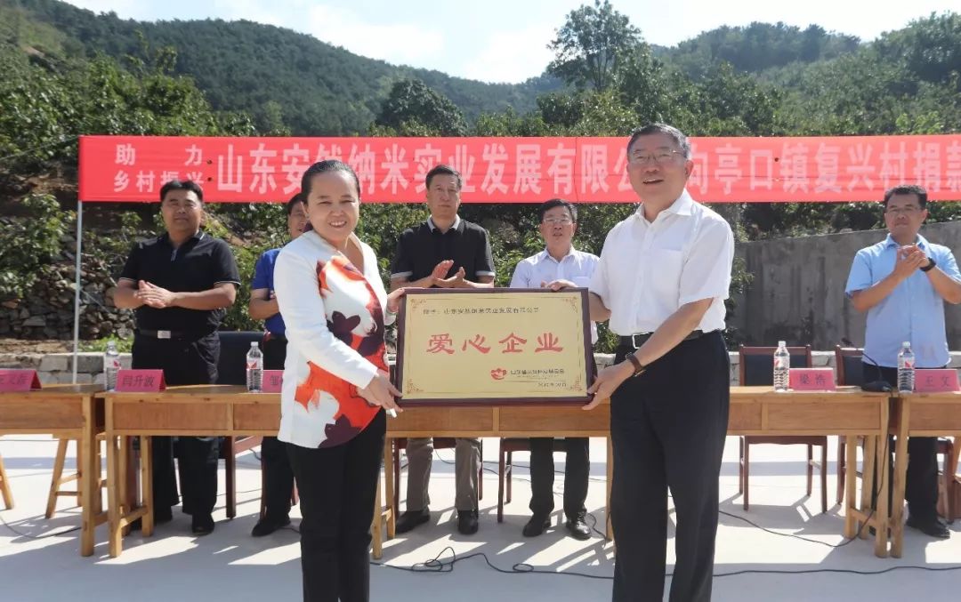安然公司副董事长、总裁梁浩女士代表安然公司党委正式向复兴村捐款20万,省扶贫办也向安然公司授予了“爱心企业”牌匾和荣誉证书。