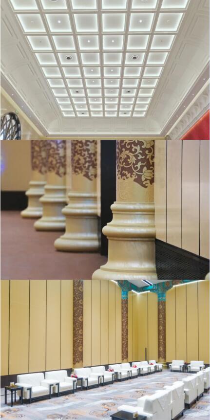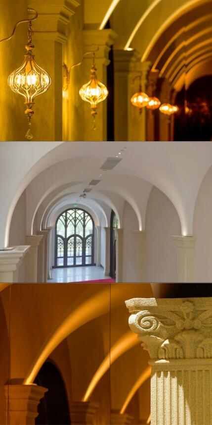 优雅精妙的哥特式四面交叉拱,在不同灯效下上演光与影的共舞,寄托着充满巧思的吉祥祝愿:从左至右分别寓意“八面来福(蝠)”、“花开富贵”、“年年有余(鱼)”