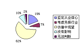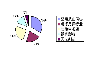 结果分析:与直销职业经理人的普遍彷徨相比,营销人员的选择主要呈现出三足鼎立之势。“考虑另择行业”的比例达到21%,很有些令我们意外,没有想到“传销罪”会对非组织者的营销人员的职业信心冲击如此之大。受调查者的选择取向表明,营销人员在可能关系到自己切身利益的时候将变得非常现实。在“坚定从业信心”和“考虑另择行业”这两个选项上,与职业经理人受影响的调查结果相比,营销人员受影响的比例分别上升了15个百分点和14个百分点,分别达到了34%与21%,其职业信心的两极分化相当严重,这也直接导致观望者的比例缩小为26%。不过总体来看,坚持与观望的人数总比例达到了74%,而且选择退出的被调查中,相当比例的是从事未拿牌的中小企业的营销人员,实力较强企业特别是拿牌企业的直销人员在受访时态度普遍比较积极。从这个意义上讲,中国直销的主流市场虽然会受到“传销罪”的影响,但是这种影响对于企业来说,是可以承受的。