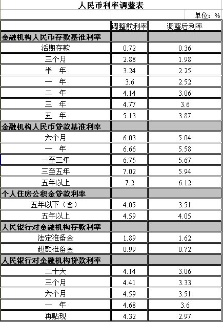 从2008年11月27日起,下调金融机构一年期人民币存贷款基准利率各1.08个百分点(新浪财经注:此为1997年10月23日降息1.80个百分点以来最大降息幅度),其他期限档次存贷款基准利率作相应调整。同时,下调中央银行再贷款、再贴现等利率。