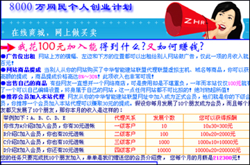 记者在网上随意输入"鼠标点点、财富滚滚"的字样,就搜索出1000多个这样的网页,其中一个发在论坛上的帖子就充满了传销的"味道":"跟我学赚钱吧,给你个大惊喜!本来我也不相信的,但试过之后真的能赚到钱。怎么赚钱呢?加入这个不要身份证、不要会员费,只要有个地址、电话号码就能挣到钱的XXX网站,申请会员后把本文复制,然后到各个网站的留言版上粘贴发表宣传。有人加入了,你就有钱赚了;加入的人越多,你赚的钱也越多。我本来也是试试看的,但到了第二个月突然来了汇款单!不看不知道,一看吓一跳!——300多美金?折合人民币不就是2000多元了吗?到了银行,交了几十元的手续费,换回了2000多元,真像做梦一样……"
