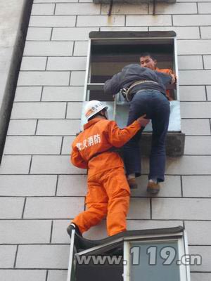 到达现场后,发现一男子双手抓着窗户两边的钢筋,双脚踩在铝合金窗户上,并且铝合金窗户一边已经被踩坏,该男子身体在不停地颤抖。据周围群众讲该男子已在上面困了近一小时,情况十分危险。现场指挥员当机立断,利用安全绳从四楼窗户救人,并在楼下不停地安慰被困者,让其保持镇定。