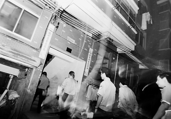 昨晚8点半,冲击第二个窝点。7个男人住在一间不足10平方米的房间,个个都是席地而睡,而另一个房间则住了两名女孩。这些人大都来自四川。推开第三间房门,一股恶臭扑鼻而来,那里堆放着他们的行李和鞋子,光鞋子就有近40双。