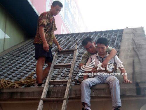 当地消防官兵接到报警后赶到现场,爬上一楼阳台,给小何绑好安全绳(见上图),让他从消防梯上慢慢滑下来。在大家的共同努力下,经过10分钟紧张营救,终于将小何安全转移到地面。