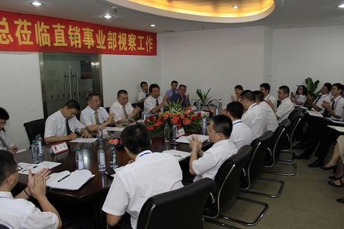 2009年10月19日下午2点,集团怀汉新董事长、副总经理潘皓皓、副总经理张铁城、党委书记王凤义、总经理助理金东以及集团产品部经理马炳南等集团领导首次以最强大的阵容来到东莞,对我直销事业部的整体工作进行了考察和指导。直销事业部总裁朱厚丞代表全体员工对怀总等集团领导的到来表示最热烈的欢迎和最衷心的感谢。他指出今年直销版块发展速度不断加快,直销前三个季度的业绩同比实现了3倍的增长,在即将进入第四季度冲刺阶段,在制定太阳神直销未来3年发展规划的关键时期,希望得到怀总和集团各级领导给予更多的支持和指示,给我们的员工以更多的激励。同时,希望借此机会,让直销各版块的主要骨干就各版块的工作情况向集团领导做汇报。