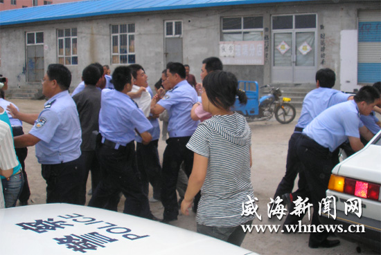 当日下午1时许,记者闻讯赶到文登市公安局工商派出所时看到,一伙青年男女正站在派出所门口指手划脚,吵吵嚷嚷。30多分钟后,所内一名工作人员外出时遭到这伙人的强行阻拦。巡逻民警和赶来的环山派出所民警制止了这些人员的行为,并将现场的19名男女带回审查。