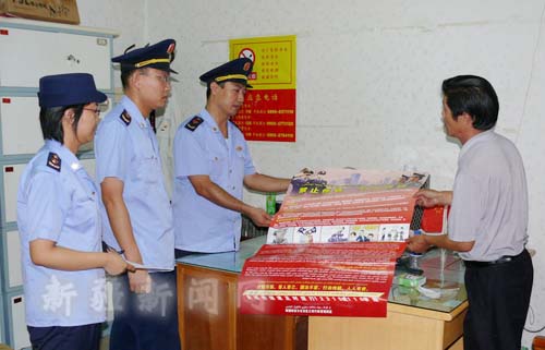 图为执法人员在张贴禁止和打击传销以及规范直销的宣传画