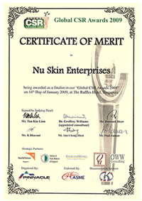 2009 年1月14日,如新新加坡分公司被亚洲知名的全球企业社会责任机构授予2009年“最佳企业社会责任奖”,成为首家获得此项殊荣的直销公司。这一荣誉的获得不仅是对如新集团多年来始终秉承“善的力量”企业文化理念的积极肯定,也更是对其长期在社会公益事业中所做出卓越贡献的高度认可和赞许。