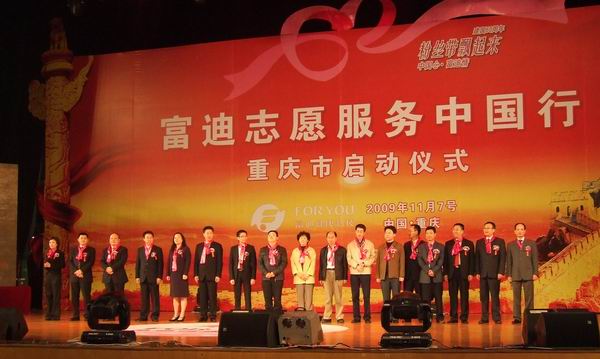 在“‘粉丝带飘起来’富迪志愿服务中国行重庆市启动仪式”,陈怀啸副董事长代表富迪向重庆市妇联捐赠了39万元妇女健康用品,用于援助贫困家庭妇女。富迪的爱心让很多需要帮助的人感受到了温暖,营运总裁董德在启动仪式上跟来自广西、广东、江西、武汉、湖南、四川的经销商伙伴们提前透露了富迪2010年的慈善行程:“明年6、7月份,富迪将组成爱心车队,重走长征路,在革命老区学习革命精神,走一路捐赠一路,把爱心传递开来!”