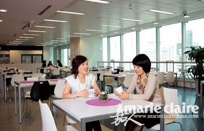 与传统日企的中规中矩不同,索尼(中国)的女员工们允许化精致的妆容,用个性、女人味的衣着代替千篇一律的套装。每个办公室都有更衣间,女员工的比男员工的更宽敞。在大楼里,每走几步路便能看到风格迥异的休息区,还有一个上下贯通三层的多功能中庭,阳光从外面洒进木地板。