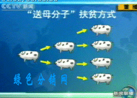 8、央视表扬养猪乘法方式扶贫:云南惠泽县决定:先让农民免费领到1头良产母畜,产了很多仔后,必须要拿出两头来免费再送给其他的贫困户,如此循环滚动式多层次倍增效应发展之后,500头一下子就变成了几万头以上了!云南会泽县副县长朱廷发说:“有利于增强贫困户的自我发展能力”,计划在5年内覆盖全县5万户绝对贫困户。下面就是中央电视台播放的图片中的二幅: