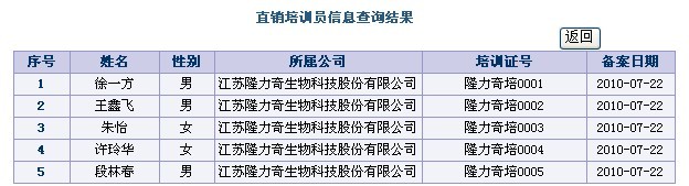 笔者从商务部直销行业管理信息系统上获悉,江苏隆力奇生物科技股份有限公司第一批共5名直销培训员诞生,这是商务部直销行业管理信息系统自2009年7月22日公布隆力奇获牌后首次公布其直销培训员信息。