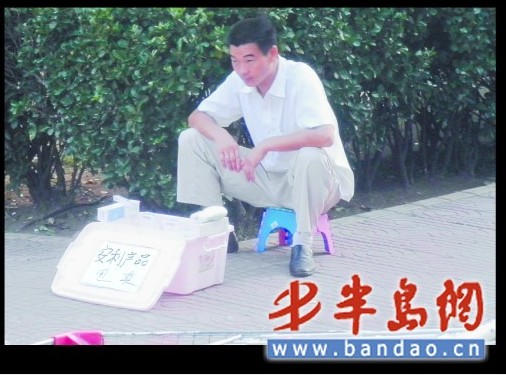 根据郑女士的描述,7月21日上午,记者在威海路附近见到了四五个正在摆摊出售安利化妆品的小贩。他们大都操着外地口音,在阴凉处摆上一个整理箱或手提袋,整理箱前摆放着写有“安利化妆品 3折”字样的纸板。这些小贩大都单独行动,每相隔七八米远就会看到一个向行人兜售化妆品的小贩。记者经过其中一个中年男子身边时,男子不失时机地向记者推荐:“美女,安利化妆品打折了,最后两瓶,给你两折就行。”小贩拿出一款保湿乳液,大谈它的益处,然后又拿出一支眼霜,“买两样再给你便宜一点!”标价300多的产品只卖60元。“是真的吗?怎么那么便宜?”男子见记者感兴趣,于是说:“我们的商品保证正品,都是从厂里偷出来的!”于是,记者便从男子手中购买了一款眼霜。