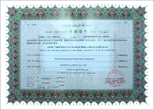 经中国伊斯兰教协会派员赴新会生产基地实地考察通过,近日,无限极公司增健口服液等多款产品,获得中国伊斯兰教协会颁发的清真证书,可供穆斯林民众食用。