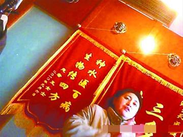 在简陋冰冷的专家室里,两个女专家一会儿说吃他们的东西对各种疾病都有疗效,一会儿又说保健品对多种疾病都有修补作用。可她们身后却挂着有“神水医百病 生物传四方”这样落有患者名字的锦旗。 明星记者 栾俊学 摄