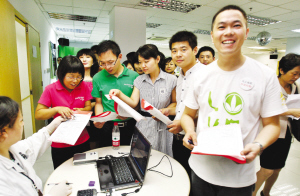 销售部员工贾春雷(图右一 记者 楼文彪 摄)是一位献血状元,他从1999年就开始无偿献血,自从开始献血后,更是每28天捐献一次血小板,迄今为止献血量已超过3.5万毫升,他兴奋地说:“有了自己的献血日,以后每年都能和同事一起奉献爱心,更加有意义。”