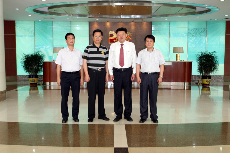 | 颜总与朱勤虎副局长(右二)等领导合影 | 领导一行参观保健食品厂 | 颜总向领导们介绍公司检测中心 |