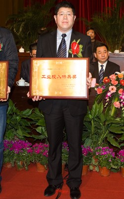 董事长助理刘爱峰先生代表三生公司领取鄞州区工业标杆企业“工业投入标兵奖”