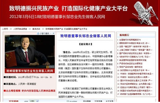 2012年3月6日晚18时,中国医药质量管理协会副会长、中国保健协会副理事长、延边朝鲜族自治州第十一届政协常委、致明德集团公司董事长邹忠全先生将做客人民网演播室,就致明德振兴民族产业,打造国际化健康产业大平台进行现场访谈。