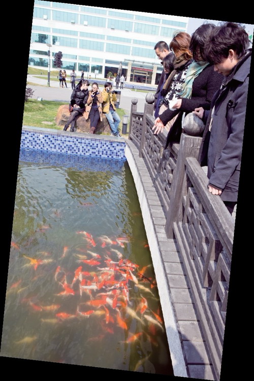 每一个阳光明媚的中午,园区葫芦形的水池边上总能见到三三两两的人群,用米饭、饼干或者面包喂着池里的锦鲤,看着鱼儿们成群结队地争食。无论是水池里的鱼还是谈笑风生的人,都如阳光般跃动着活力。