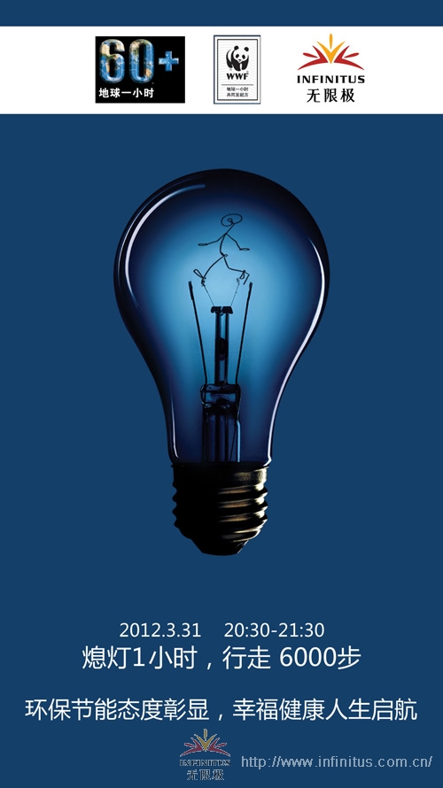 “无限极地球一小时”微博已经开启,请在新浪微博搜索“熄灯1小时-行走6000步”,与我们一起分享你的关灯计划吧。