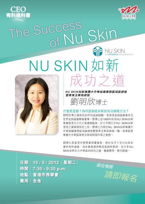 如新乃全球最大且发展最迅速的直销公司之一,凭借其与众不同的经营之道及秉持商德的卓越表现,集团大中华组织事务区域副总裁暨华东及华南总裁刘明欣博士(Angela)以香港直销协会会长身份,应香港市务学会邀请,于5月15日(星期二)的〝CEO有料过料会〞担任演讲嘉宾,分享如新的成功之道及直销事业的发展。