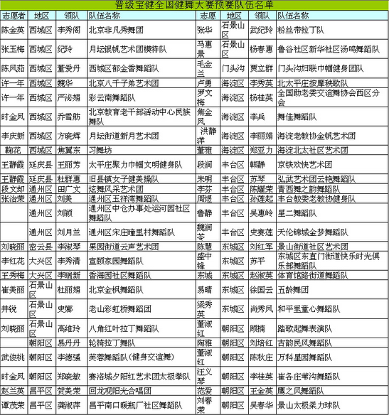 自宝健全国健舞大赛报名以来,活动组委会总共收到了近千支队伍的报名申请。在相关公证处的监督下,经过专业评审团的筛选,最终有50支优秀队伍进入预赛。现将晋级预赛队伍名单公布如下: