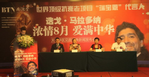 2012年8月17日-20日,一代球王,足球传奇、瑞宝恩全球品牌代言人——迭戈?马拉多纳将现身中国,践行韩国BTN与中国尚源堂联手举办的“浓情八月•爱满中华——马拉多纳中国行”活动安排,续写马拉多纳慈善中国行的传奇。为此,韩国BTN大中华区唯一推广合作机构中国尚源堂量子生物科技有限公司,特于2012年7月16日在北京富力万丽酒店会场召开了针对此行的新闻发布会,对马拉多纳行程安排进行了通报和解读。据悉本次马拉多纳慈善中国行所得善款,将全部应用于中国本土的慈善事业,助力中国和谐社会建设和体育事业的发展。