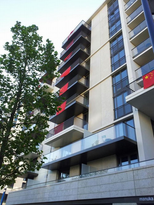陈楠的老搭档苗立杰则向大家展示了奥运村内中国国旗的威武,“我们的村子、国旗很有气势吧!”