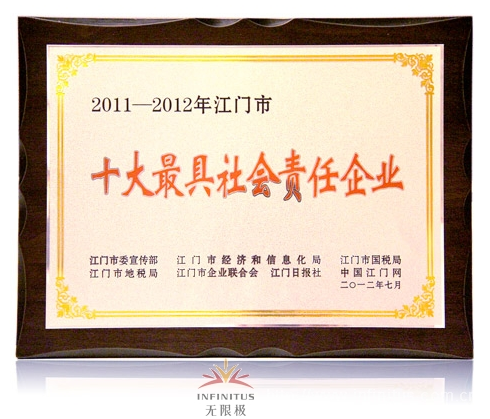 7月25日, 在由江门市委宣传部、江门市经济和信息化局、江门市国税局、江门市地税局、江门市企业联合会、江门日报社和中国江门网主办的“2011—2012江门社会责任企业颁奖典礼暨企业社会责任论坛”上,我司荣获“2011—2012江门十大最具社会责任企业”。