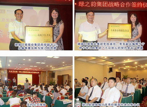 2012年8月8日上午,绿之韵集团与湖南日报报业集团《大众卫生报》战略合作签约仪式在长沙新闻大酒店成功举办,开启了湖南省保健食品龙头企业绿之韵与全民健康公信平台合作战略的新格局。湖南日报报业集团党组书记、社长覃晓光,湖南日报报业集团党组副书记、总编辑董岳林,湖南日报报业集团党组成员、常务副总编辑马宁,湖南日报报业集团副总经理兼大众卫生报社社长徐勇及《大众卫生报》全体员工见证签约。绿之韵集团董事长胡国安、董事常务副总裁劳嘉、企划新闻副总监李经成等集团高管及张建军、黄翔、张新等近二十名绿之韵优秀经销商代表共同出席。