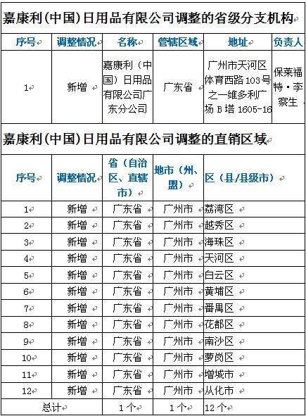 2012年10月23日,商务部直销行业管理信息系统网站公布了嘉康利(中国)日用品有限公司调整直销区域的信息。广东省分公司成立,直销区域新增广州市12区。