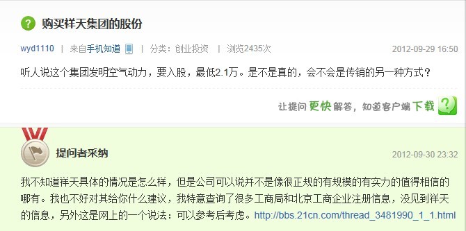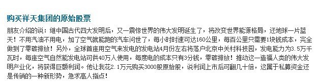 6月9日,反传销网再次接到宁夏吴忠李先生关于祥天原始股的咨询,经过工作人员的分析和讲解,李先生庆幸没有投资。李先生在电话中表示,他的好朋友找他购买祥天空气动力控股集团出售的原始股,告诉他该公司的空气动力发动机是一个划时代的高科技项目,有前景,将在纳斯达克上市。据李先生反映,目前吴忠市已经有大量人员出资购买了此原始股,如果不及时制止,会有大量人员上当受骗!