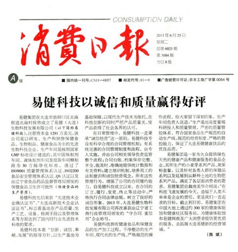 2013年6月25日,《消费日报》综合报道大连易健科技以诚信和质量赢得好评。