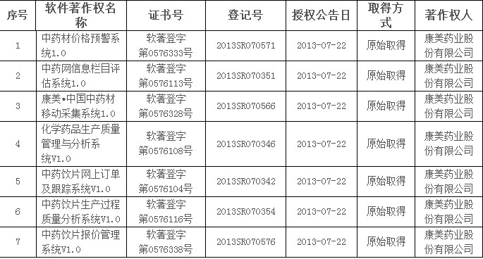 近日,康美药业又成功获得国家版权局颁发的中药材价格预警系统1.0、康美•中国中药材移动采集系统1.0、中药饮片网上订单及跟踪系统V1.0等7项计算机软件著作权证书,方式均为公司原始取得。