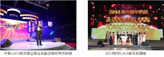 在隆重的启动仪式环节,中脉科技公司高管带领中脉LACA美体事业部管理团队一起登上了舞台,共同开启了以“焕然一新,心动未来”为主题的启动仪式,在启动仪式之后,中脉LACA美体事业部业务副总裁邱伟杰更是现场宣布了中脉LACA 2014财年30亿的新目标,让在场的LACA家人信心满怀并且倍感期待。