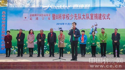 嘉康利中国公司高级副总裁、公益基金主任李重华在捐赠仪式上表示:“嘉康利公司是有60年历史的天然营养品公司。嘉康利进入中国后受到政府和广大消费者的支持,企业发展的同时坚持不忘回馈社会。嘉康利在中国设立了公益基金,其宗旨之一就是帮助青少年健康成长。在过去的4年多里,嘉康利公益基金已经走进中国20个省、市、自治区的很多乡村学校和少数民族学校,尽其所能帮助那里的老师和同学们。今天,我们非常荣幸来到了吴忠市为8所学校建设少先队活动室,在此,也特别感谢宁夏自治区各级政府的支持,感谢与嘉康利长期合作的北京青基会,感谢学校的师生,也感谢支持和参与我们公益事业的嘉康利经销商伙伴,并祝同学们学习进步、身体健康,德智体全面发展!”