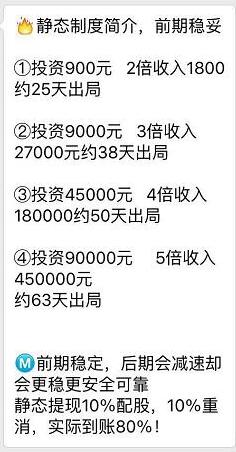 其中,静态收益主要是积分提现。积分初始价为0.1元,公司业绩每增加100万,积分上涨0.01元。当然,静态收益是有上限的:初级为投入金额的两倍,即1800元;中级为三倍,即27000元;高级为四倍,即180000万元;特级为五倍,即450000元。“翻番的回报”足以让人心动。