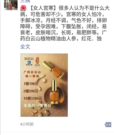 而本网在“白云山精油吧”看到,发布的帖子中除了介绍能够治疗各种疾病之外,很多人在贴吧发布招商代理的信息,本网随后加了一位代理商,据他介绍,只要投入一千多元获得市级代理就能发展下线,每发展一级就有钱拿,甚至淘宝上也能开店。