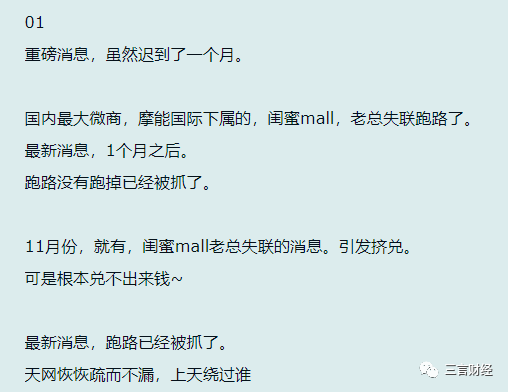三言财经从多方渠道获悉,被称为中国最大微商公司的“摩能国际”因旗下的“闺蜜MALL”涉嫌传销被“一锅端”,核心成员全部被警方带走。