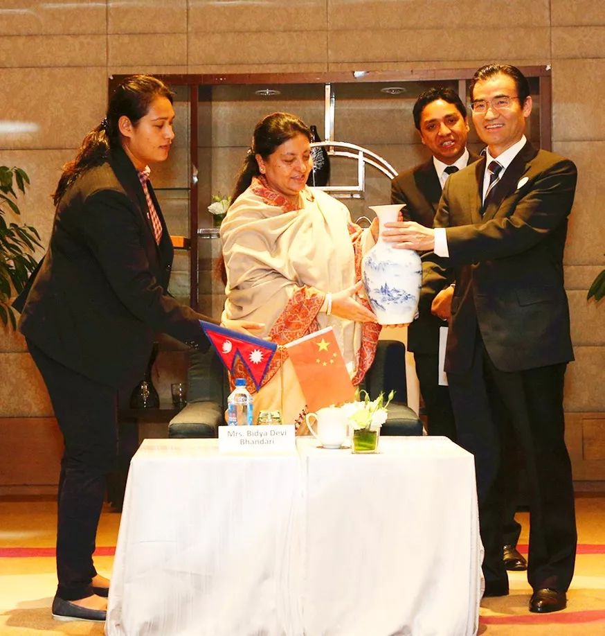 论坛开始前,尼泊尔总统比迪娅·德维·班达里与部分参会人员进行会谈。在会谈中,董事长韩金明先生向班达里总统赠送了一份特别的礼物——青花瓷瓶。在英文中“瓷器(china)”与中国(China)同为一词,是中国文化的重要代表,表达了韩金明董事长与和治友德对中尼友好关系源远流长的真挚祝福。