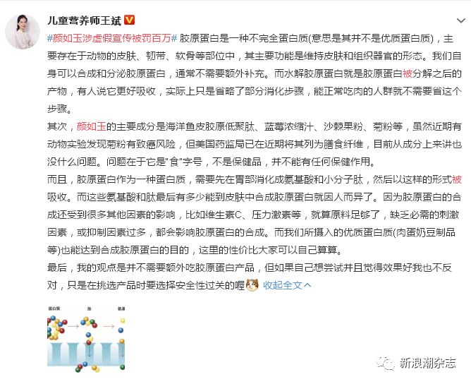 儿童营养师王斌发微博称,她认为人体通常无需额外吃胶原蛋白产品。“胶原蛋白是一种不完全蛋白质(意思是其并不是优质蛋白质),其主要功能是维持皮肤和组织器官的形态。我们自身可以合成和分泌胶原蛋白,通常不需要额外补充。其次,颜如玉的主要成分是海洋鱼皮胶原低聚肽、蓝莓浓缩汁、沙棘果粉、菊粉等,它是“食”字号,不是保健品,并不能有任何保健作用。
