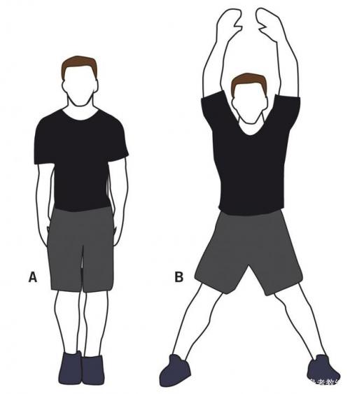 动作拆分:双腿站立,挺腰收腹,双臂自然下垂,双腿同时向外跳跃分开,双臂屈起保持在胸前,双腿收回、双臂紧接收回还原;保持动作连贯及呼吸节奏30-40s结束。