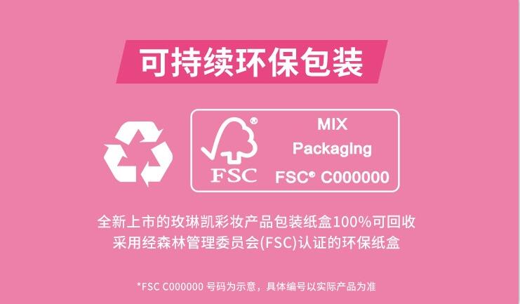 新上市的彩妆品共18款,涵盖了CC霜、眼影、腮红、唇膏等全线产品。其中所用到的外包装纸盒均采用通过森林管理委员会(FSC)认证的环保纸张,这意味着所使用的纸张都来自可持续发展的、合法的且允许采伐的森林资源。同时,为了让外包装纸盒实现100%可回收,玫琳凯革新了覆膜工艺,取消了纸张上的塑料覆膜层,在确保质感和对产品保护力的同时实现对环境的考量。未来,玫琳凯计划在2022年上市的彩妆新品的纸盒也会沿用相同的环保材料。