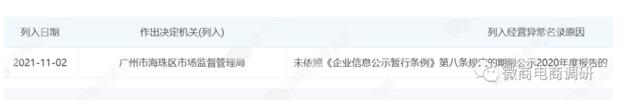 广东浠芮管理咨询有限责任公司原名为佛山涵浠生物科技有限公司,法定代表人依然是张硕,独资股东为李亚惠,早在2021年11月,该公司就因未依照《企业信息公示暂行条例》第八条规定的期限公示2020年度报告,而被广州市海珠区市场监督管理局列入企业经营异常名录,且至今仍未被移除。