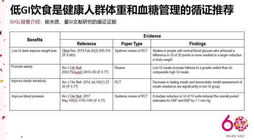 我们经过系统综述RCT文献的检索和总结,发现低GI饮食对于健康人群的体重和血糖管理是有益的,具体来说,它有助于降低体重、增强饱腹感、提高胰岛素敏感性、调节血压等。目前的科学文献表明,它的作用机制与能量分配、饱腹感增强、炎症改善、外周与中枢神经内分泌反馈等相关。低GI/GL的膳食模式也有助于皮肤健康(减少痤疮的发生)和运动耐力等,具体效用还有待持续研究。