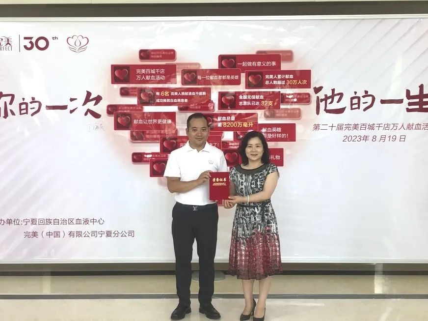 2016年,完美宁夏分公司获颁“全国无偿献血促进奖单位奖”荣誉牌匾;2017年,自治区卫计委授予分公司“爱心应急献血集体”荣誉牌匾。