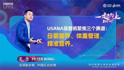 USANA全球副总裁 中国区总经理Peter王生先生在2025葆婴全国经销商大会中点明,在不确定的环境下需要USANA葆婴,现在就需要USANA葆婴。邀请所有伙伴说出我们共同的心声“生生不息,一起向上”!他表示,USANA基因里的核心关键词就是细胞、健康和家庭。希望USANA葆婴实现公司专业化、中国化,伙伴职业化,产品赛道化,队伍年轻化。